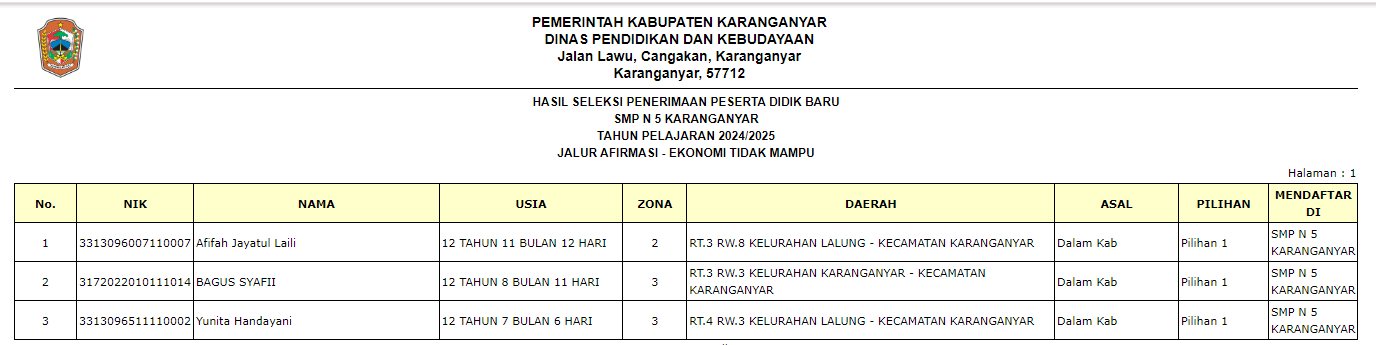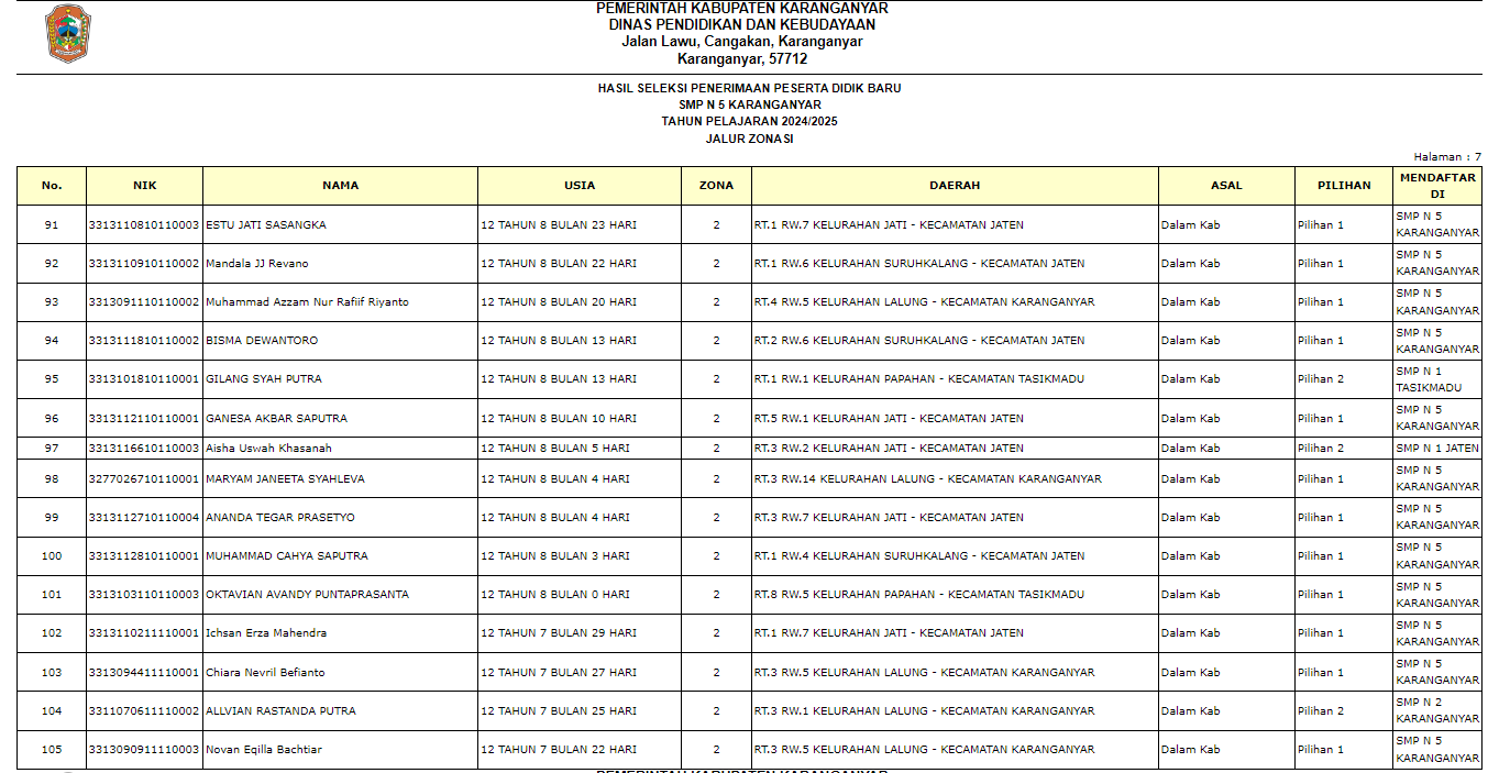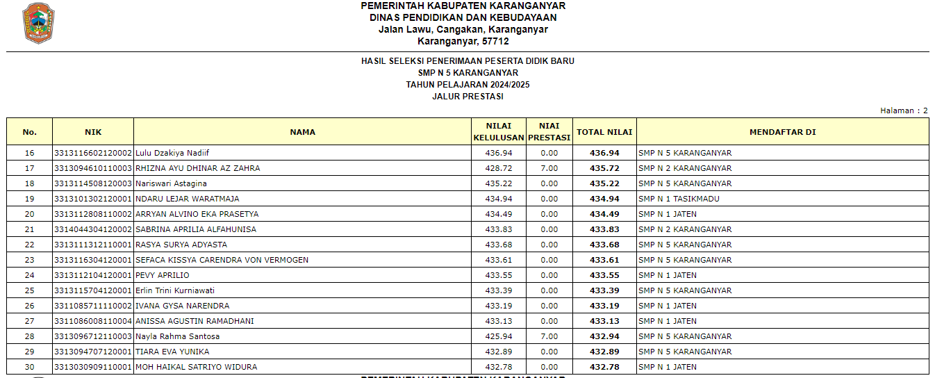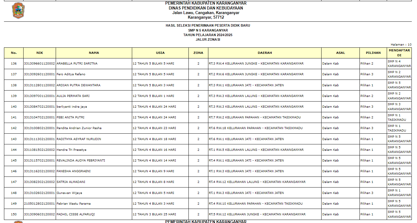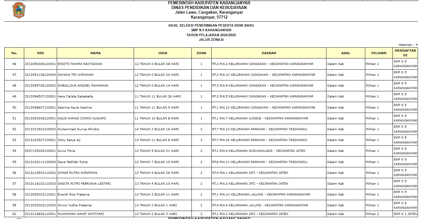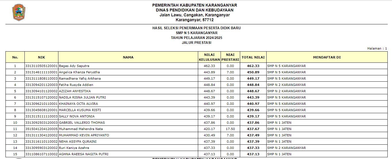 Pengumuman Penerimaan Peserta Didik Baru (PPDB) di SMP Negeri 5 Karanganyar Tahun Ajaran 2024/2025 melalui Jalur Zonasi, Jalur Prestasi, Jalur Perpindahan Tugas Orang Tua, dan Jalur Afirmasi.